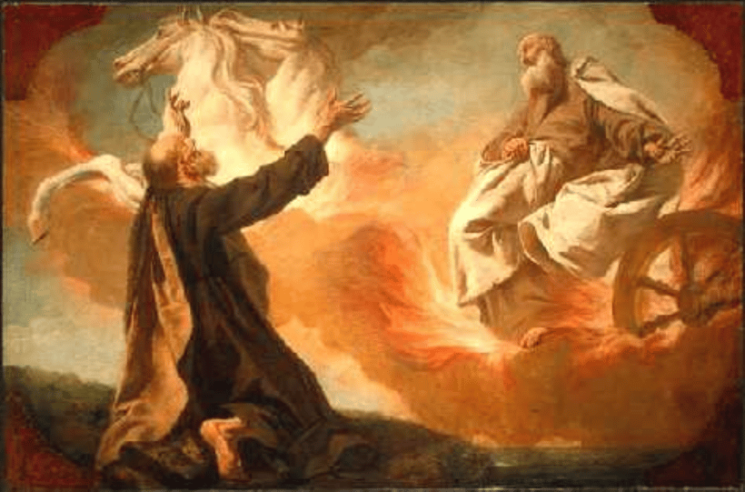 Und da sie miteinander gingen und redeten, siehe, da kam ein feuriger Wagen mit feurigen Rossen, die schieden die beiden voneinander, und Elia fuhr also im Wetter gen Himmel. 2. Könige 2, 11